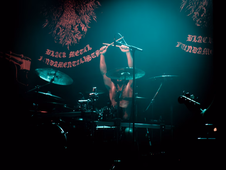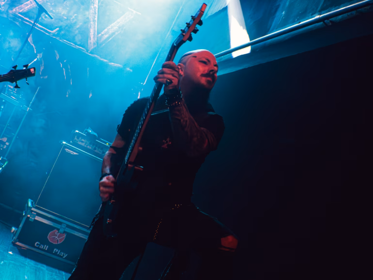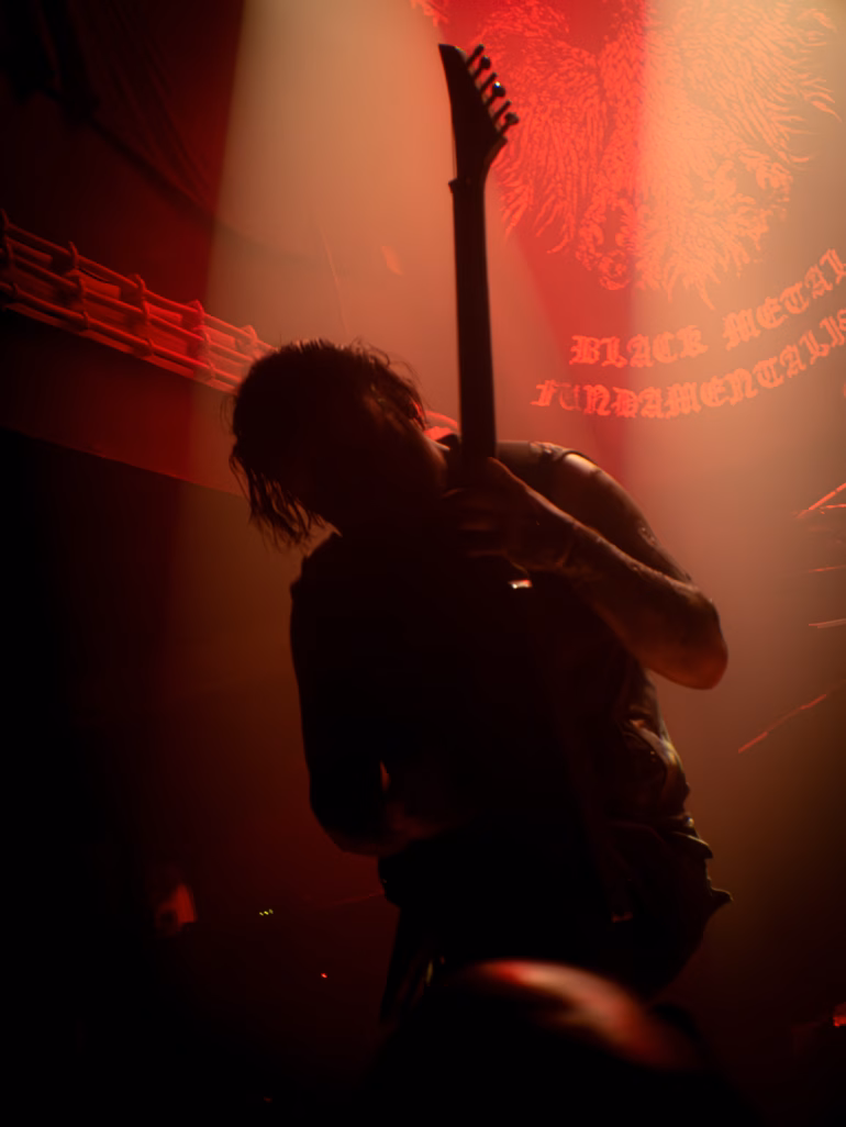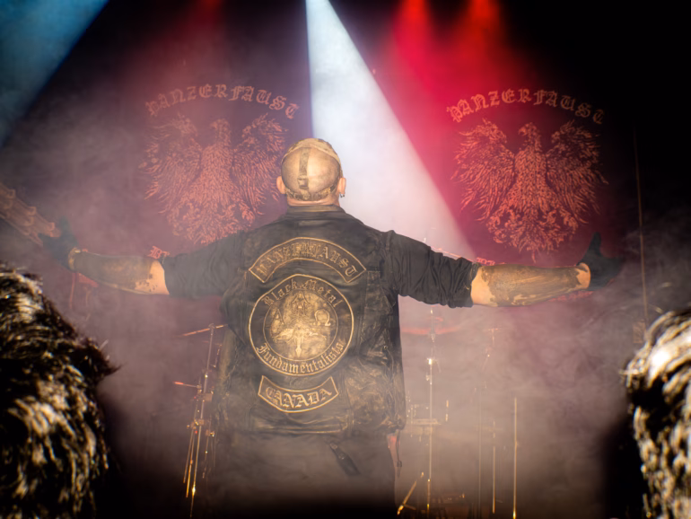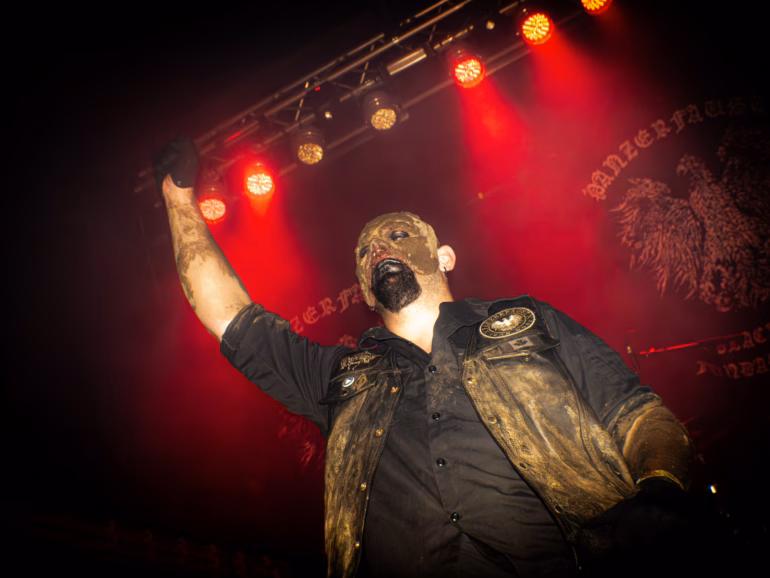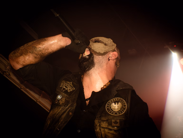 Depois, Panzerfaust tomaram o palco. Besuntados em lama, como saídos das trincheiras do inferno, despejaram uma hora de Black/Death Metal sem concessões. O foco recaiu na monumental série The Suns of Perdition, uma saga iniciada em 2019 e continuada com Chapter IV: To Shadow Zion (2024), que mergulha nos horrores da guerra e na rejeição dogmática da fé. Desde o primeiro tema, The Day After Trinity, sentiu-se o impacto na sala. Cada blast beat, cada riff dissonante, soava como um eco de fogo e lama. Com Goliath e Brock Van Dijk (guitarrista e vocalista) a trocarem berros atormentados, a banda projetou uma presença avassaladora, um equilíbrio entre poder, ritual e disciplina. Apesar de não haver mosh, a dissonância reverberou pela sala e foi sentida em cada corpo.